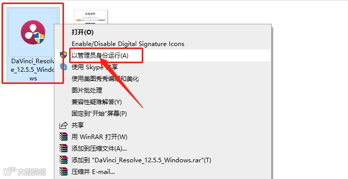 4.鼠标右击【DaVinci_Resolve_12.5.5_Windows】安装程序,选择【以管理员身份运行】。