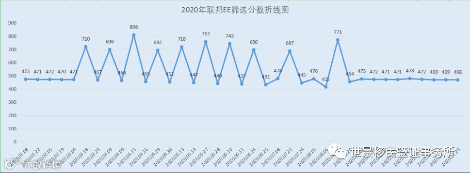 伴随着EE系统里程碑式的筛选记录,本次筛选分也不意外的进一步下降到468分,是2020年不分类别筛选的最低分数,而且本轮筛选的Tie-breaking rule维持在半年前的6月4日,EE筛选分的下行压力很大。目前EE系统中470分以上的申请人不足3000人,这意味着如EE系统保持高频率,每次5000人的筛选力度,筛选分回落到460分段是大概率事件。