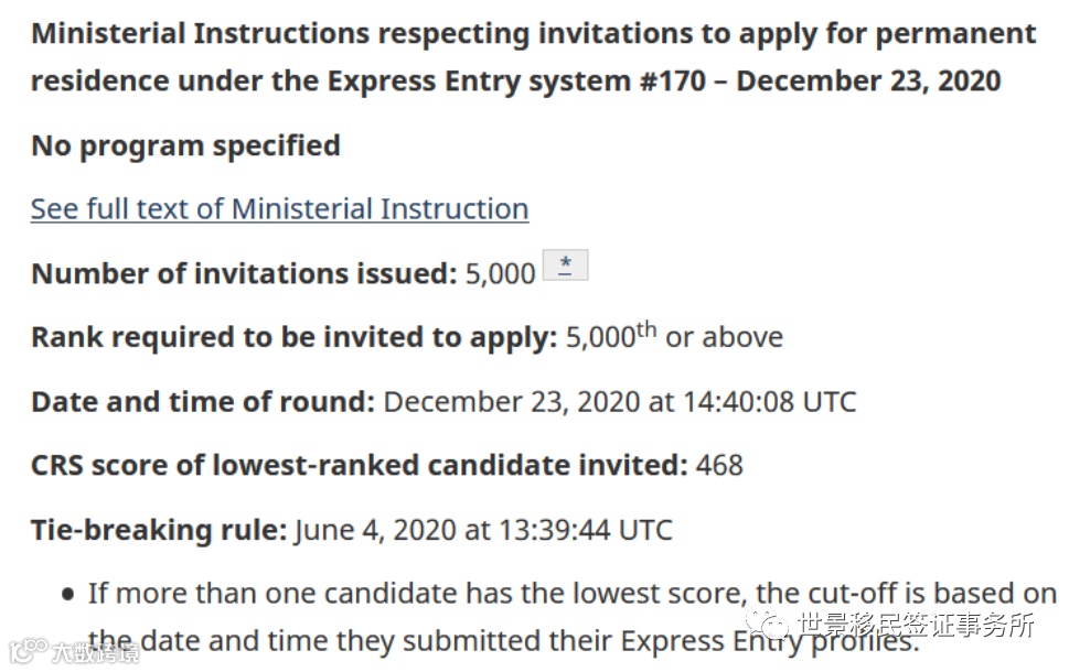 加拿大渥太华时间12月23日,快速通道EE系统进行了第170次筛选,筛选分为468分, 共有5000申请人获邀筛选。本次筛选又创造了EE历史上的新纪录: