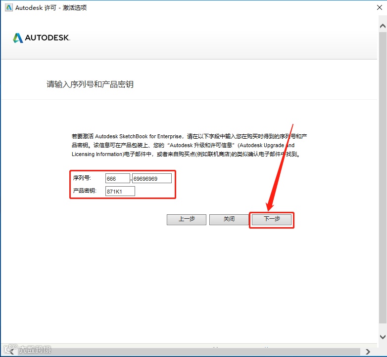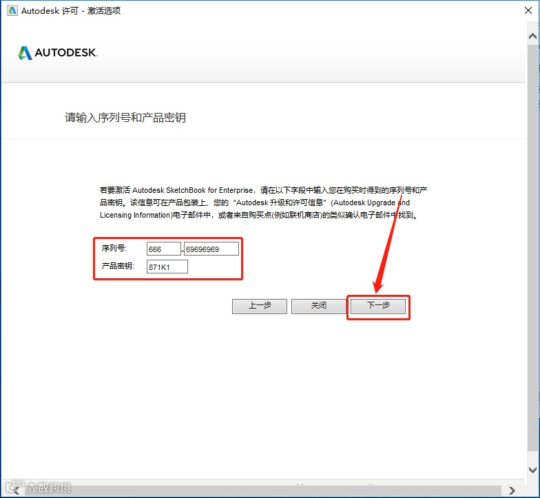 15.输入序列号:【666-69696969】,密钥:【871K1】,后点击【下一步】。