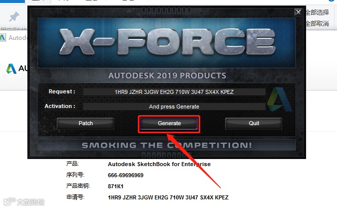 26.使用Ctrl+C键复制申请号,使用Ctrl+V键粘贴到注册机里面的【Request】中,点击注册机左下角的【Patch】。