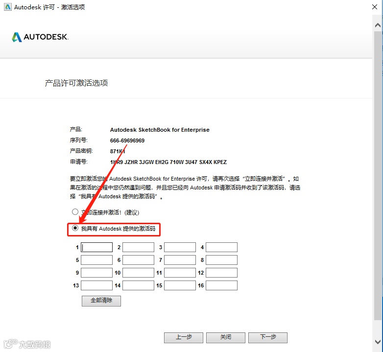 29.全部选中Activation中生成的激活码,使用Ctrl+C键或者鼠标右击复制生成的激活码,粘贴激活码至我具有Autodesk提供的激活码方框中,点击下一步。