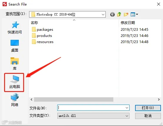 11.找到ps cc2018安装路径中的一个名为【amtlib.dll】文件。打开【此电脑】。