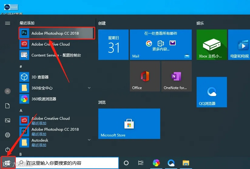 18.在桌面左下角的开始菜单栏中找到并打开ps cc2018软件。
