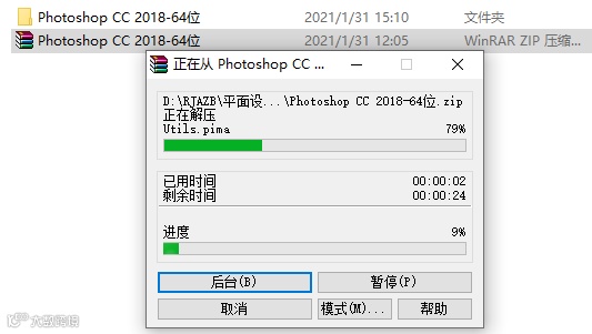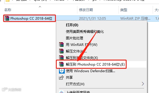 1.下载ps2018软件安装包,鼠标右击压缩包解压到【photoshop CC 2018-64位】。