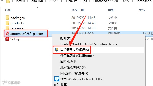 8.返回到安装包文件夹,鼠标右击【amtemu.v0.9.2-painter】注册机,选择【以管理员身份运行】。