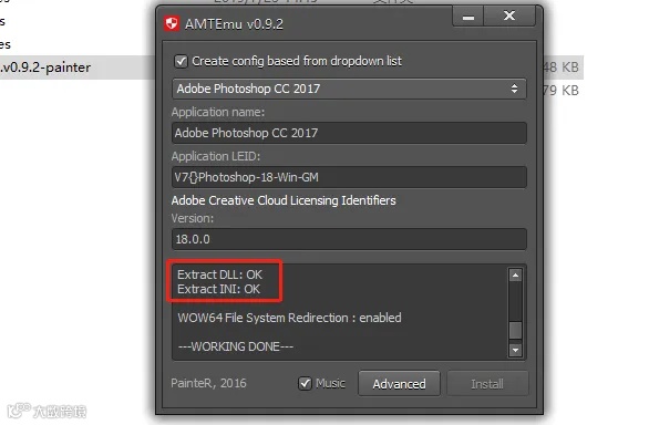 17.当注册机底部方框中如下图所示显示两个OK,说明ps cc2018软件安装成功。