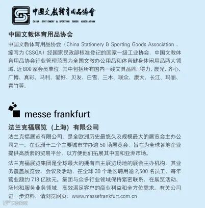 你可能还不知道,中国文教体育用品协会(CSSGA)将与法兰克福展览(上海)有限公司强强联手!共同打造Paperworld China2020!平台将覆盖全产业链,从行业调研、制定行业标准及规划-研发设计-生产制造-仓储物流到市场销售&国际交流,展会将全面提高产业联动性,促进国际交流,推动中国文教办公用品行业的创新、转型升级和高质量发展。