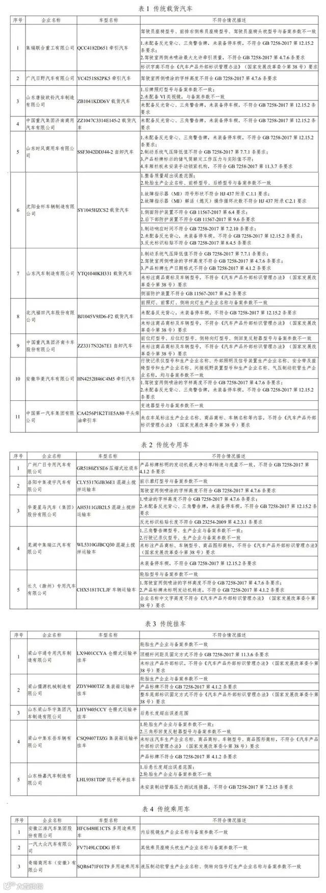存在生产一致性问题的车型包括:传统载货汽车,共涉及11家企业的11个车型产品,涉及制动系统、侧后防护装置、(OBD)系统故障指示器、标志标识等项目不符合国家标准或管理规定。