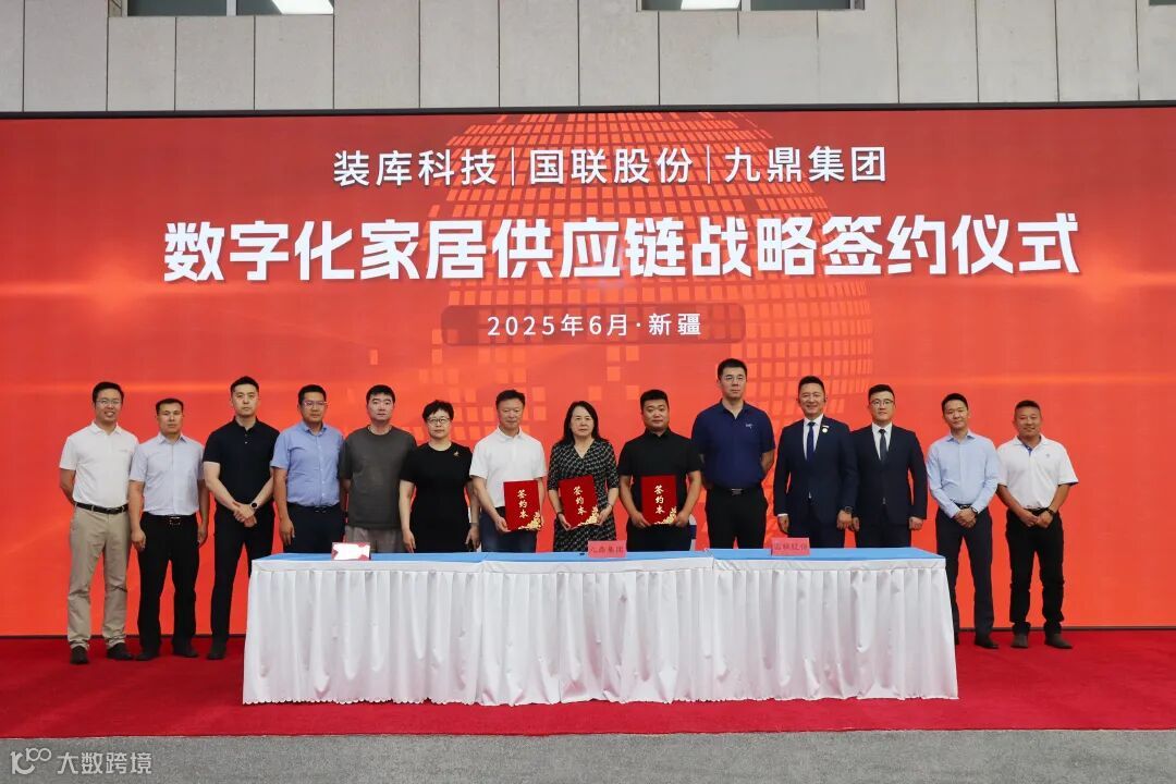6月28日,在国联股份高级副总裁、涂多多CEO刘斋等人的见证下,国联股份新疆总经理、涂多多副总裁李庆与装库科技董事长王敬,九鼎集团党委书记、董事长刘智燕共同签署“数字化家居供应链战略合作协议”,三方将在展厅建设、仓储布局、平台系统落地等多个维度展开深入合作,携手构建面向新疆及周边国家的高效协同供应链体系,打造数字住居产业走向西北及中亚的“桥头堡”。