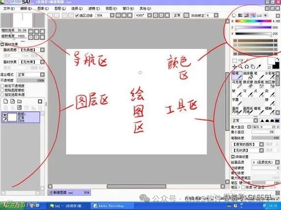 1、打开在本地下载的SAI软件,打开软件后,进入软件的界面,您可以看到软件界面可以按照功能分为5个部分:导航区、图层区、绘图区、颜色区、工具区。