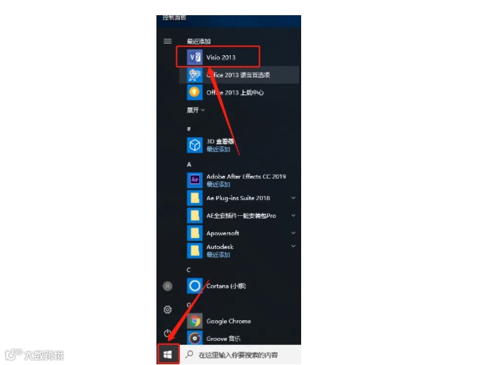 16.在桌面左下角的开始菜单栏中打开Visio 2013软件。