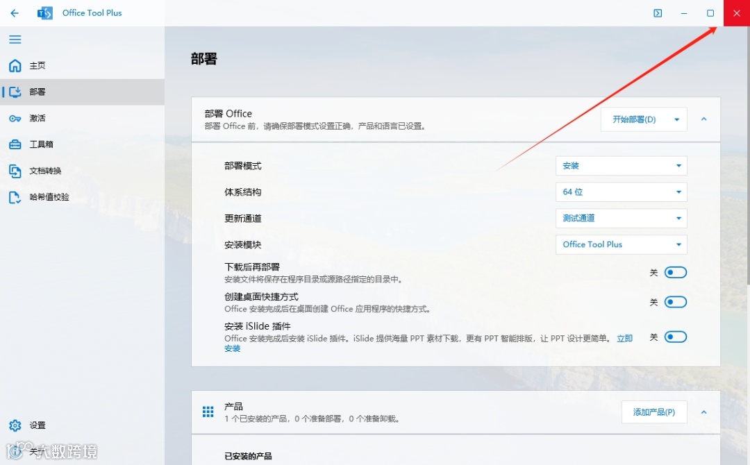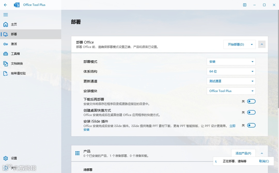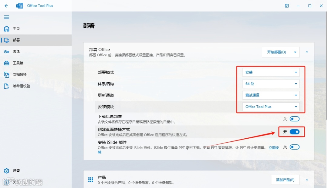 9.选择【64位】,接着选择【测试通道】和【Office Tool Plus】,最后点击开启【创建桌面快捷键】。