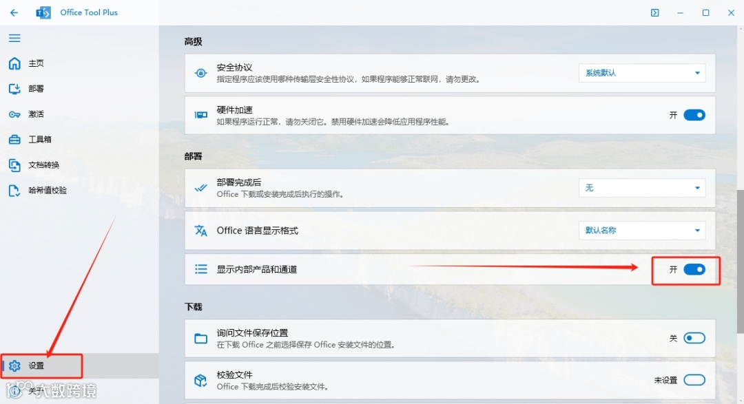 7.点击【设置】,开启【显示内部产品和通道】。