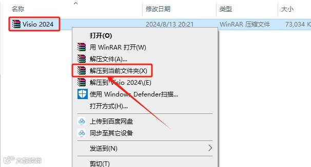 1.打开Visio 2024安装包,鼠标右击压缩包,选择【解压到当前文件夹】。