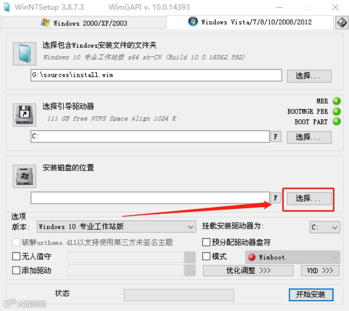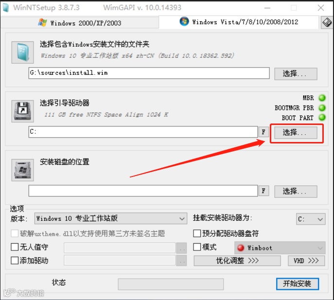 21.如果没有显示为全部绿色,则说明引导驱动器不正常,那么我们需要点击第二个【选择】继续选择其它磁盘。