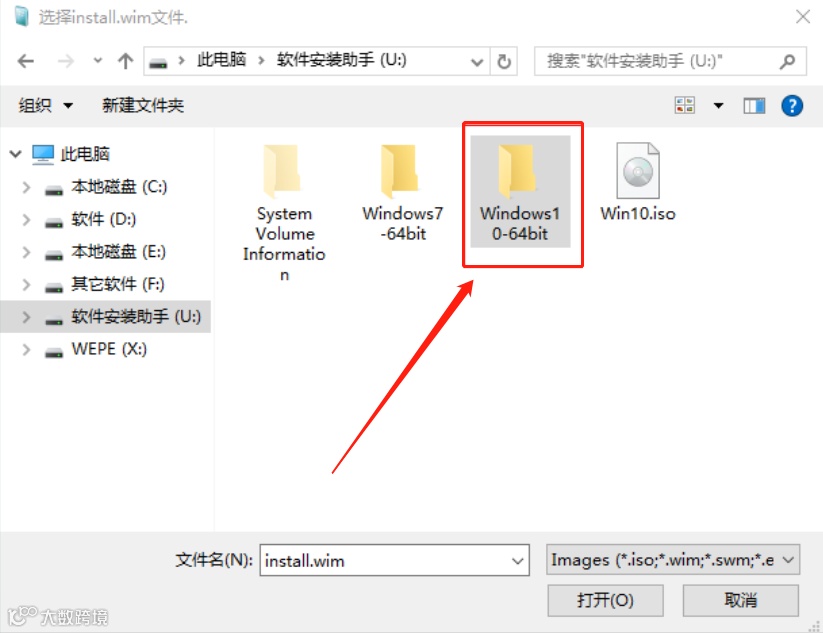 17.选中【windows10-64bit】系统镜像,然后点击【打开】。