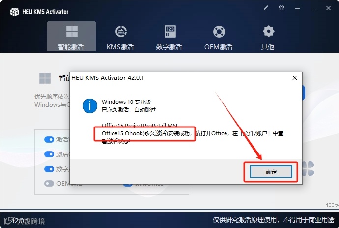 14.弹出的方框里显示已永久激活,点击【确定】,然后关闭掉激活程序。