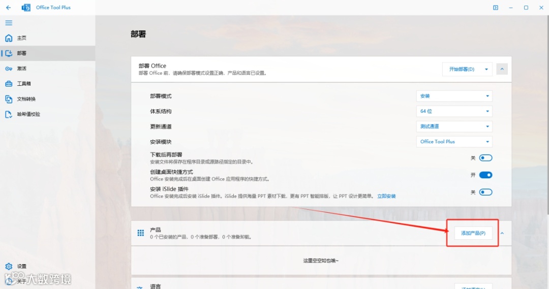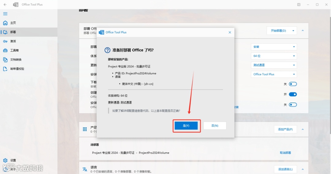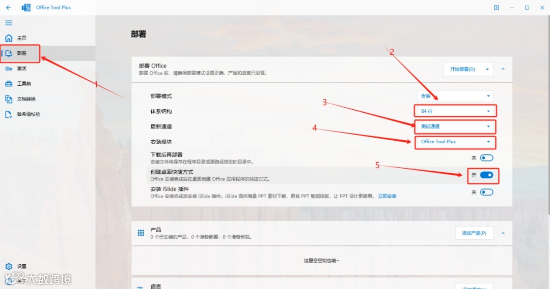 9.首先点击【部署】,然后选择【64位】,接着选择【测试通道】和【Office Tool Plus】,最后点击开启【创建桌面快捷键】。