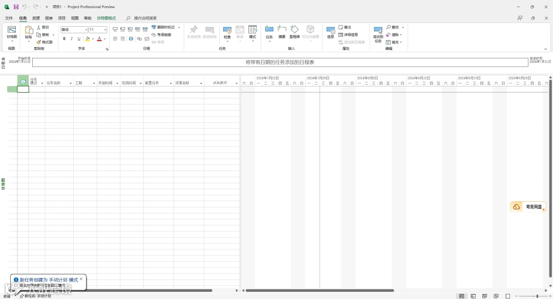 当您首先启动 Project 2010 时,您可能会对您所看到的内容感到惊奇。菜单和工具栏已替换为功能区,功能区可帮助您快速找到完成任务所需的命令。命令按逻辑组进行组织,逻辑组集中在选项卡下。