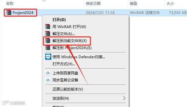 1.打开Project2024软件压缩包,鼠标右击选择【解压到当前文件夹】。