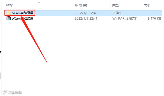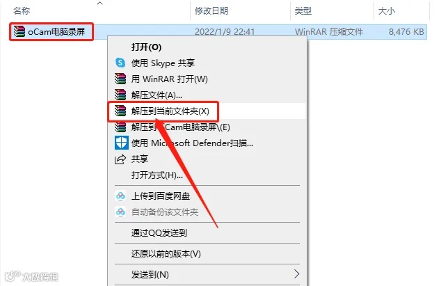 1.打开oCam安装包,鼠标右击压缩包选择【解压到当前文件夹】。