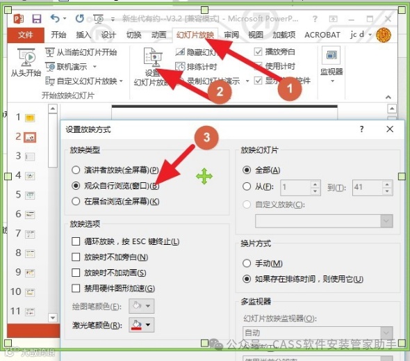 2、点幻灯片放映。设置幻灯片放映。设为观众自行设置浏览窗口。