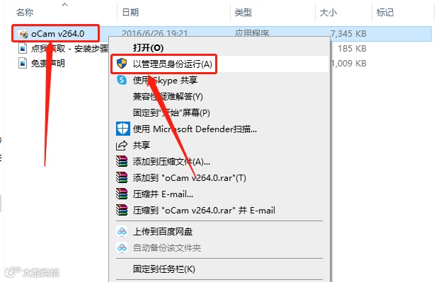 3.鼠标右击【oCam v264.0】,选择【以管理员身份运行】。