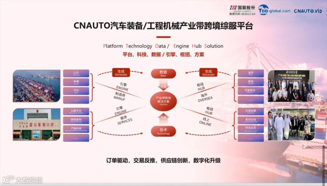 CNAUTO是国联股份旗下垂直汽车装备及工程机械产业带的跨境数字服务平台,以“产业跨境新通道+AI数字新基建”双轮驱动,提供一站式产业跨境解决方案。平台聚焦橡胶、轮胎、整车、工程机械等产业集群,依托国联“平台、科技、数据”战略,联动青岛、乌鲁木齐、重庆等自贸区及中东非、东南亚等海内外枢纽,打造“境内基地+海外中心+数字化服务”跨境生态。通过线上搭建AI大数据模型(退税、营销、合规等)、跨境新通道平台及产融科技平台,线下布局中东非海外仓和交易中心,实现全球分布式协同,推动产业带“抱团出海”,赋能中国制造全球化布局。