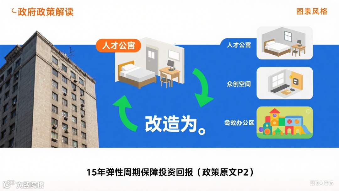 功能破局:允许老旧楼宇改造为人才公寓、众创空间、托育设施(政策原文P2),15年弹性周期保障投资回报