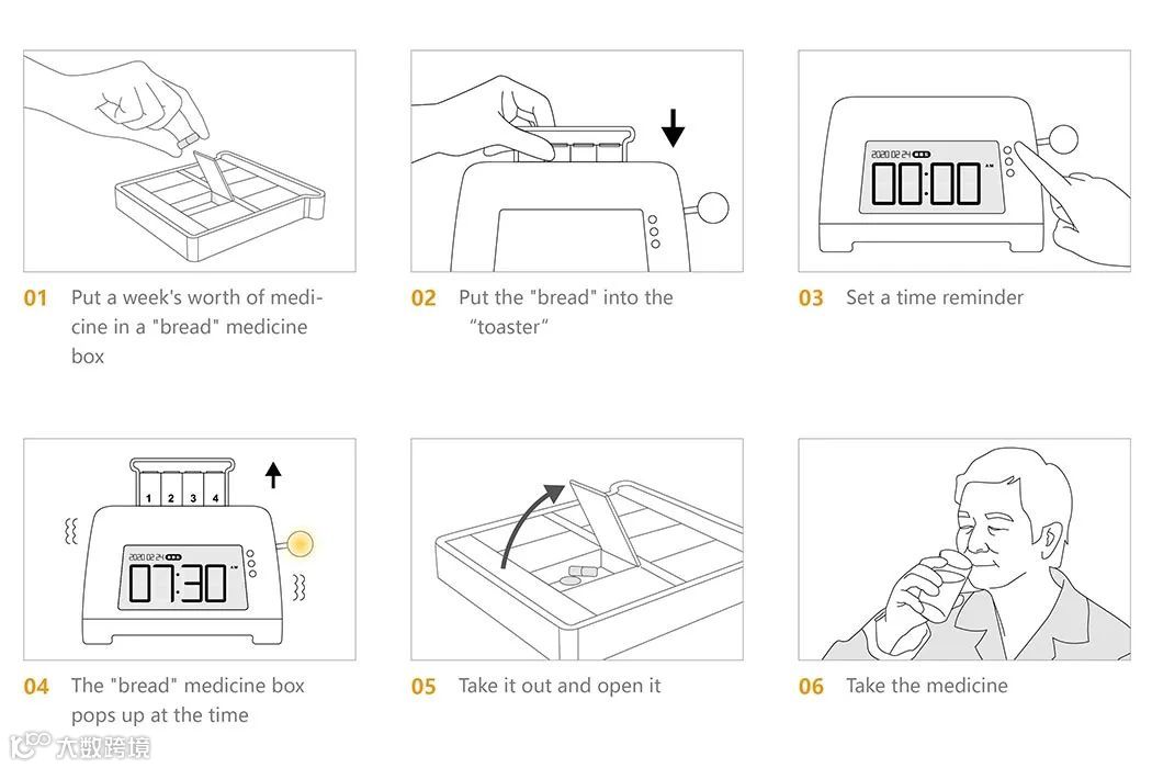 这是2020年欧洲产品设计的获奖产品。它是一个药盒,将一周的药物分成几天存放,当需要每天服用时就会弹出。这款烤面包机药盒适用于所有人,但它是专门为老年人设计的,因为他们往往更健忘。这个好玩的药盒旨在提醒人们按时服药的同时,也带来了一些趣味性。