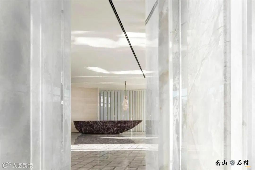 融创梅江壹号院隔断运用“热熔复合石材玻璃”,同时具备天然石材瑰丽的纹理和玻璃剔透的表现效果,让玻璃变得如玉石般华丽,玉石如玻璃般晶莹,所以梅江壹号院这款隔断也叫“玉石隔断”。