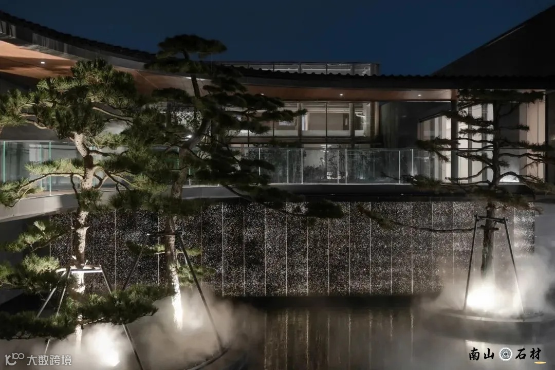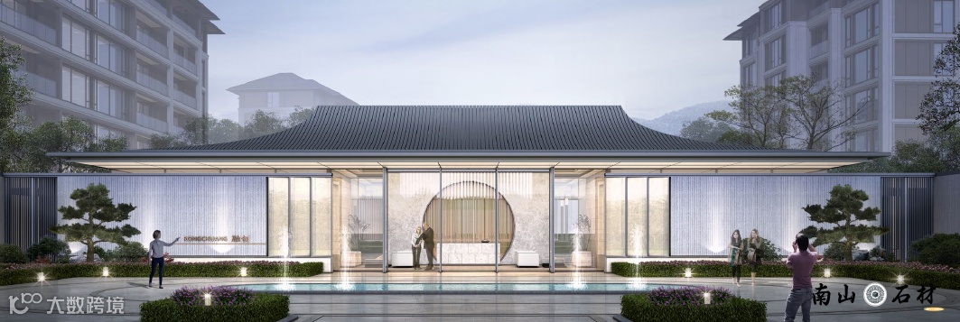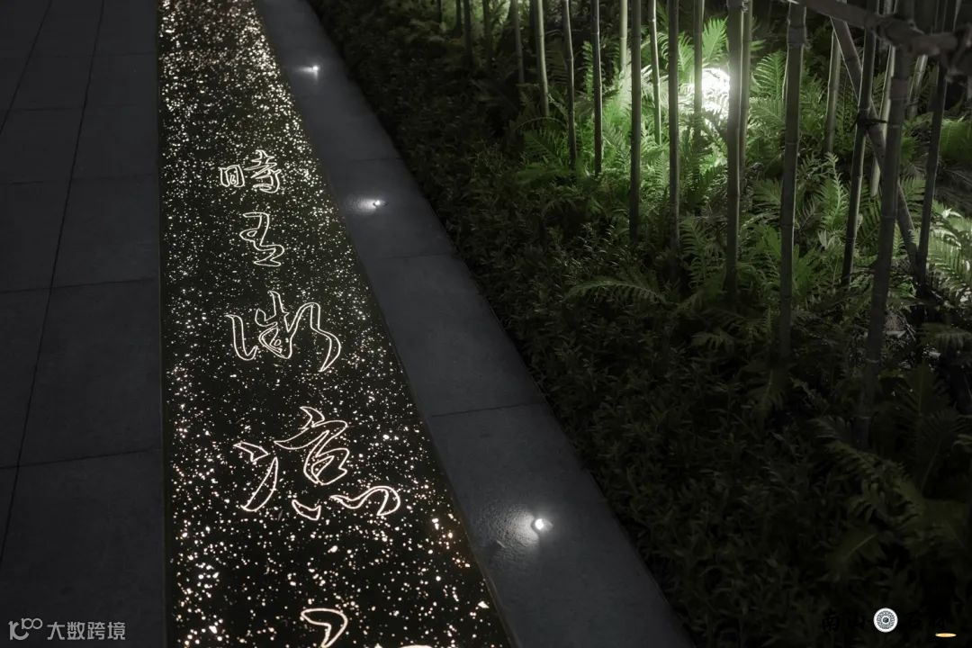 阳光城招商•檀境:泮影水景跌水墙面的热熔复合石材玻璃是采用超白钢化玻璃拉槽面火山岩,而入口地面发光对联则是使用超白钢化玻璃+仿古面火山岩透光石材,创造出“学游商文住,宅园庭院廊”的意境。