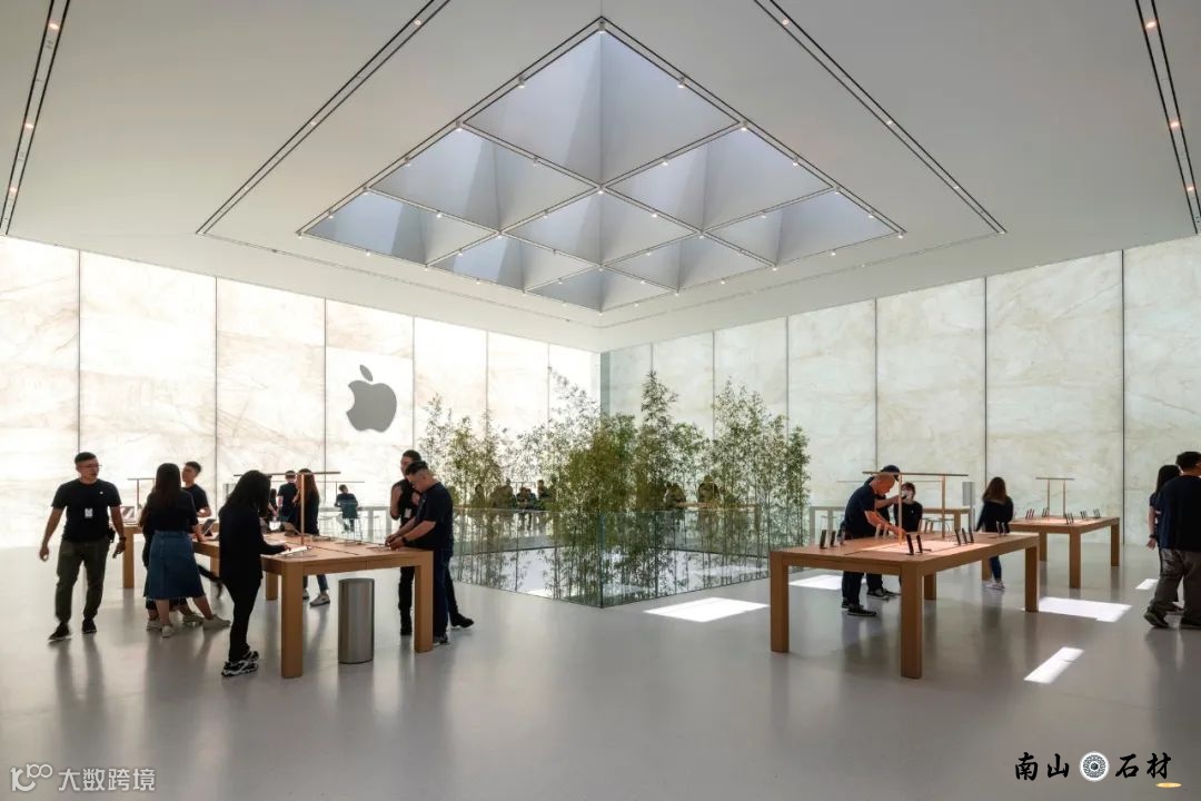 苹果澳门金沙城中心店建筑外立面简洁的几何体,是由一种新型材料组合而成,区别于传统的石材立面。玻璃和薄石板组合在一起构成了一个五层结构的复合型立面,创造出了一种类似于玉石般半透明状的发光效果。