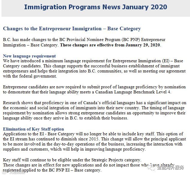 发布对企业家移民候选人增加的“最低语言水平要求”。这个改动有助于帮助移民候选人成功地在当地建立他们的事业,并融入BC省当地社区。同时,这也是响应BC省对联邦的承诺。