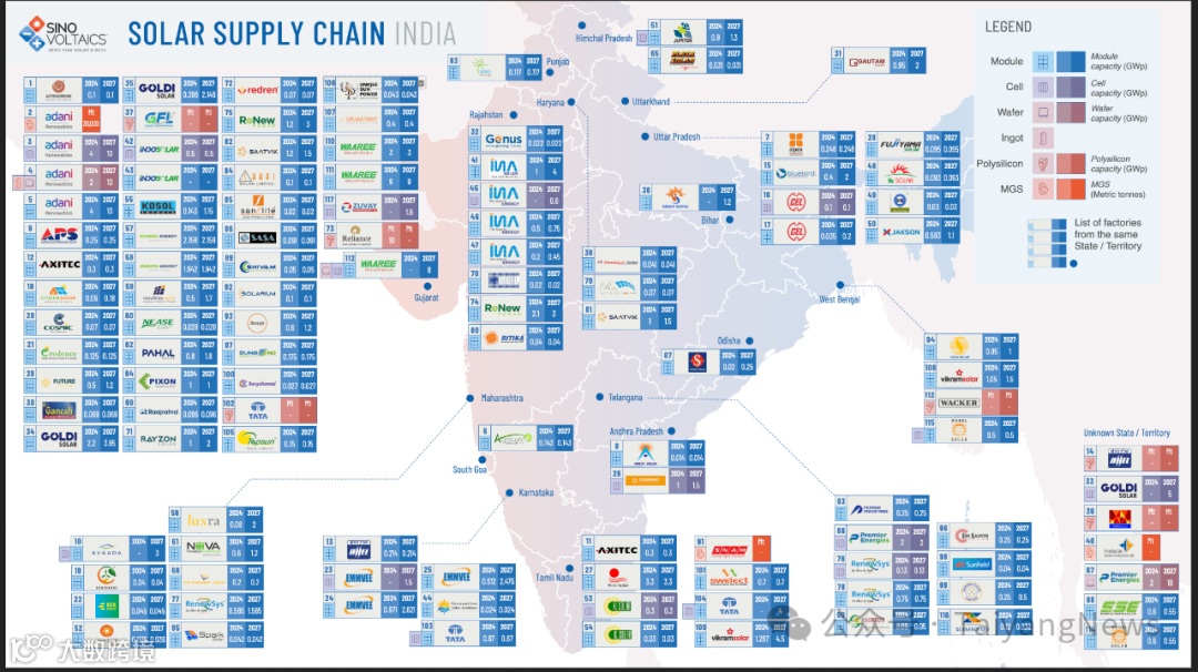 根据荷兰、德国联合咨询机构 Sinovoltaics 发布的《2025 年印度光伏供应链图谱(India Solar Supply Chain Map Edition 1 - 2025)》,印度正迅速在全球光伏行业中崭露头角,预计到 2030 年,其光伏组件年产能将超过 120GW,与此同时其一体化整合能力也在提升。