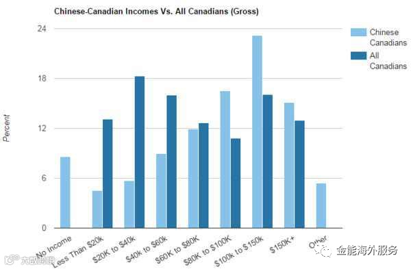 在2万-4万档,差距拉得更大,华人占比5.7%,而全国数据为18.3%。其中6万-8万这一收入档次的差距基本最小,华人和全国数据分别为11.9%和12.7%。从数据累计角度来算,年收入在8万以下的华人占比为31.1%,而全国数据为39.9%,也就是说,加拿大华人一定程度上拉动了加拿大整体的收入水平。