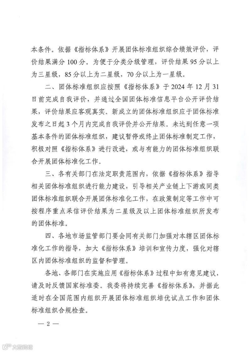 一、依据《指标体系》开展团体标准组织综合绩效评价,评价结果满分100分。为便于分类分级管理,评价结果95分以上为三星级,85分以上为二星级,70分以上为一星级。
