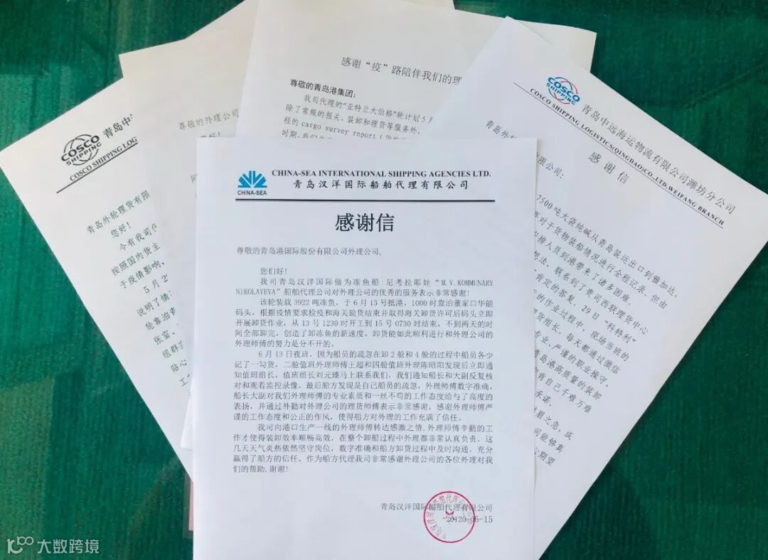 公司在感谢信中提到,他们代理的7500吨大袋纯碱从青岛装运出口到
