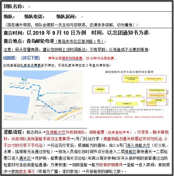 1. 集合时间地点:请于离船当天早晨检查确认带齐所有个人物品后,前往指定地点集合统一下船。