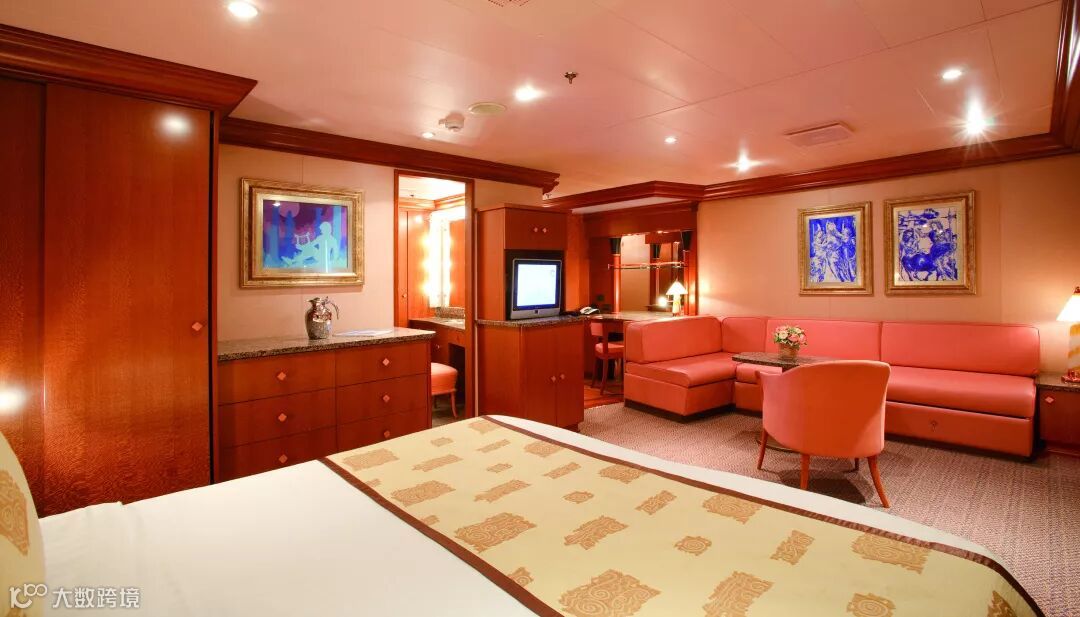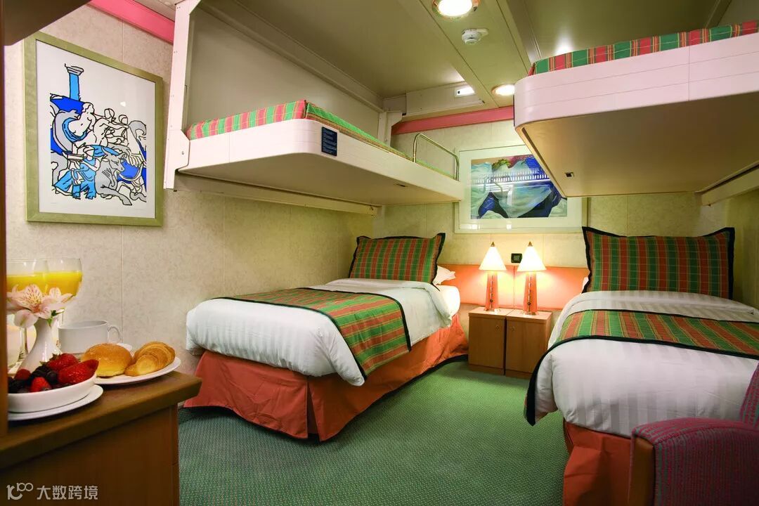 6. 邮轮舱位内铺位第一二人可拼为大床,可拆分为双床,第三四人,为沙发床或吊床,如不会使用请要求楼层邮轮服务人员协助