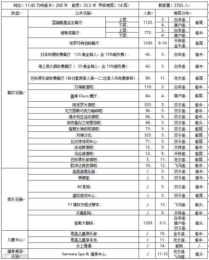 12. 餐饮:船上有三个免费餐厅:两个点餐主餐厅及 一个自助餐厅