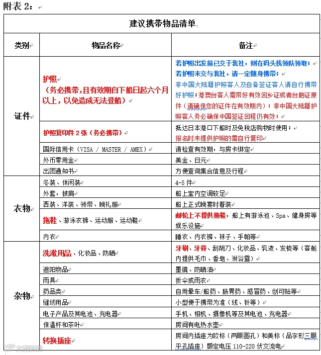 备注:开航前一个小时全部乘客都必须登船完毕,所有迟到的乘客将无法登船。注意:为了安全起见,所有乘客都不可以邀请访客登船。