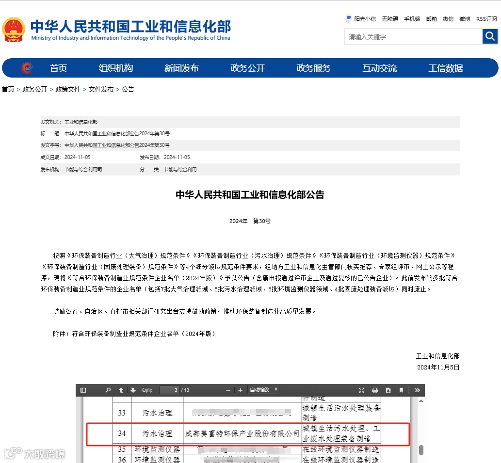 日前,中华人民共和国工业和信息化部正式发布《符合环保装备制造业规范条件企业名单(2024版)》,2024年全国共新增51家环保企业入选该名单,美富特环保集团凭借在污水处理及资源化领域的创新成果及卓越成就成为四川仅有的两家入选企业之一。