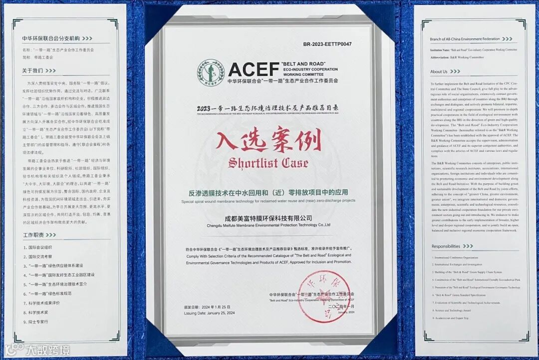 论坛现场发布了《“一带一路”生态环境治理技术及产品推荐目录》(以下简称《目录》),美富特核心子公司成都美富特膜环保科技有限公司报送的“中水回用和(近)零排放项目专用特种卷式反渗透膜技术”凭借其行业领先性和显著的经济效益成功入选。