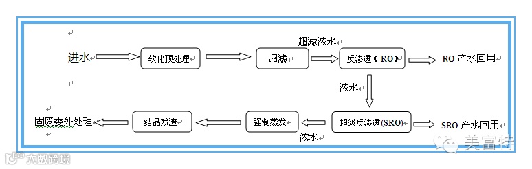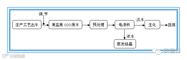 在某些医药中间体及化工厂生产过程中会产生大量含有机物的高盐废水,该废水因含盐量高,仅通过生化处理,出水很难达标排放或达回用标准。电渗析可使盐份下降至可生化标准,含盐污水经过电渗析浓缩后,浓缩液进入蒸发系统,最终达到零排放。