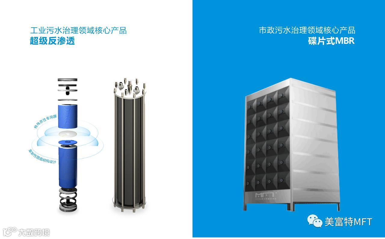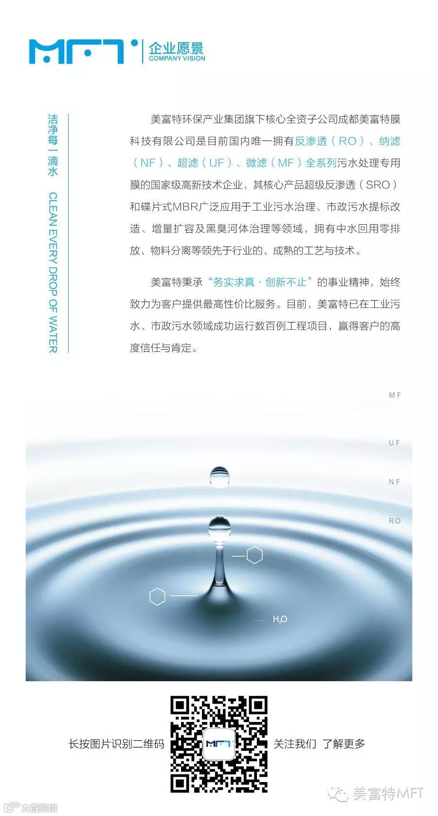 集团旗下核心全资子公司成都美富特膜科技有限公司是目前国内唯一拥有反渗透(RO)、纳滤(NF)、超滤(UF)、微滤(MF)全系列污水治理专用膜的国家级高新技术企业,其核心产品超级反渗透(SRO)与碟片式MBR广泛应用于工业污水治理以及市政污水提标改造、增量扩容、流域治理等领域。拥有中水回用零排放、物料分离等领先于行业的、成熟的工艺与技术。目前,美富特已在工业与市政污水领域成功运行数百例工程项目,赢得客户的高度信任与肯定。