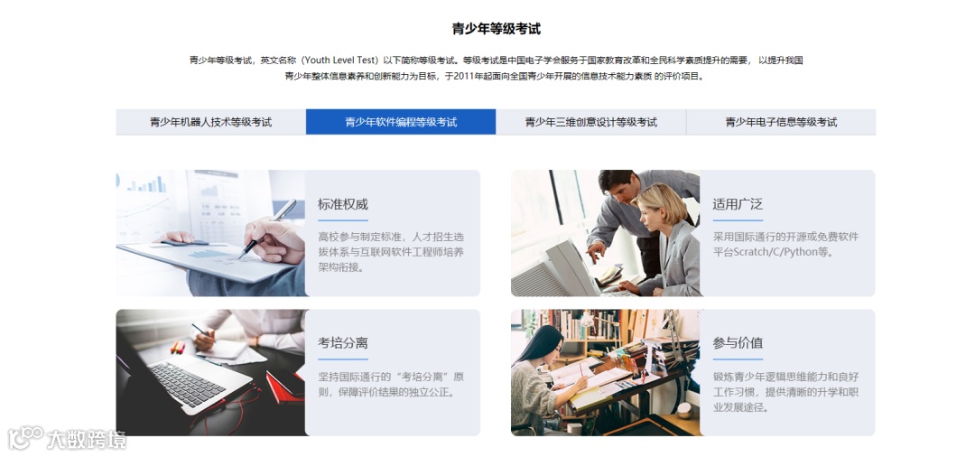 全国青少年等级考试,包括机器人技术、软件编程(Scratch/Python、C语言)、三维创意设计、电子信息四项等级考试。