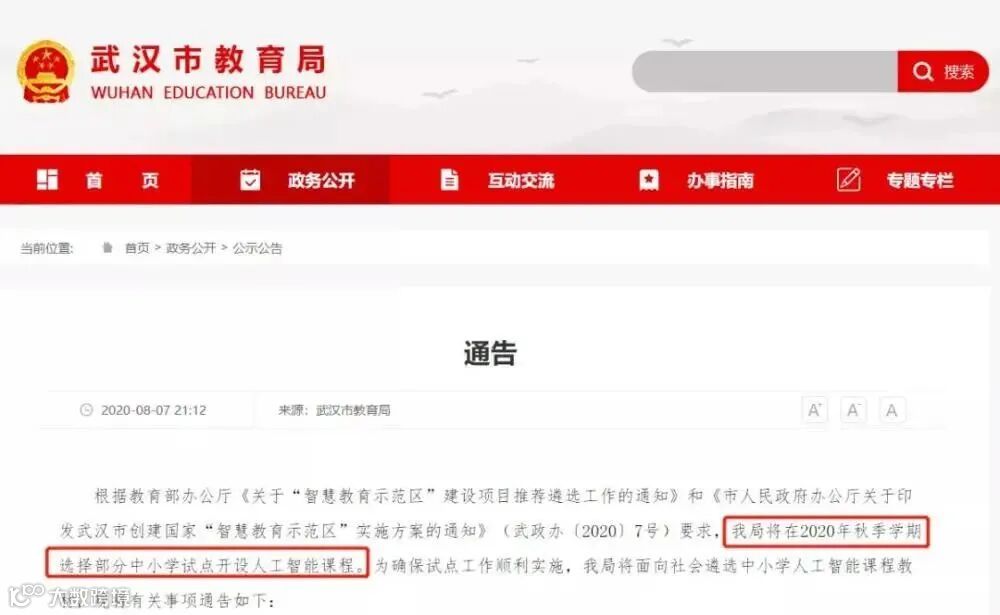 湖北省武汉市教育局发布通告,今年秋季在部分中小学试点开设人工智能的编程教育课程。