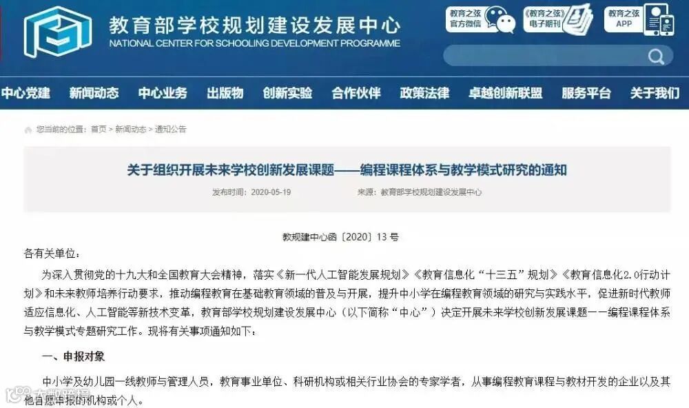 教育部学校规划建设发展中心决定开展未来学校创新发展课题——编程课程体系与教学模式专题研究工作。